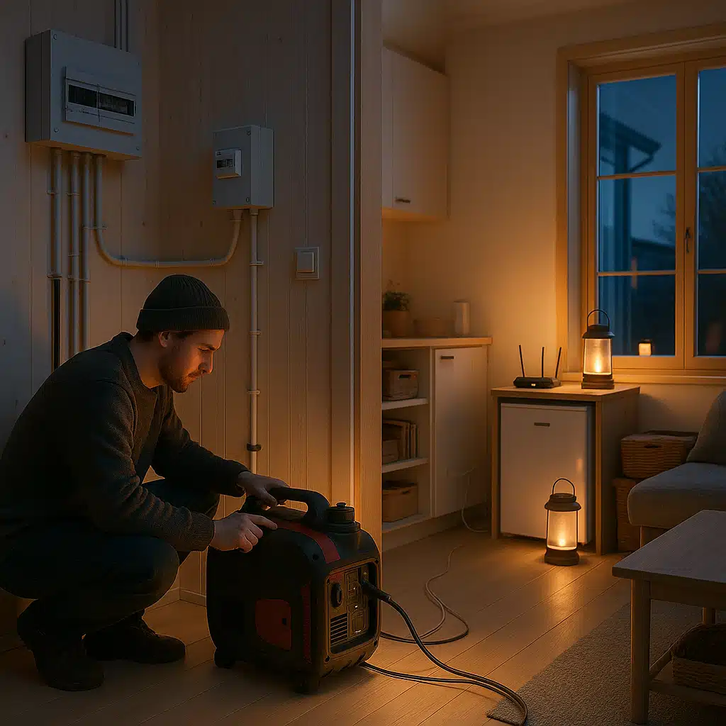 Tilslut aldrig generator direkte i en stikkontakt. Brug en godkendt omskifter/transfer switch, så der ikke sendes strøm tilbage på nettet. Sørg for ventilation, kuliltealarm ved forbrændingsmotorer og korrekt jordforbindelse. Opbevar brændstof sikkert og følg serviceintervaller. En autoriseret elektriker bør etablere fast installation og gennemgå HFI/HPFI, belastningsfordeling og kabelføring, før du tager anlægget i brug.